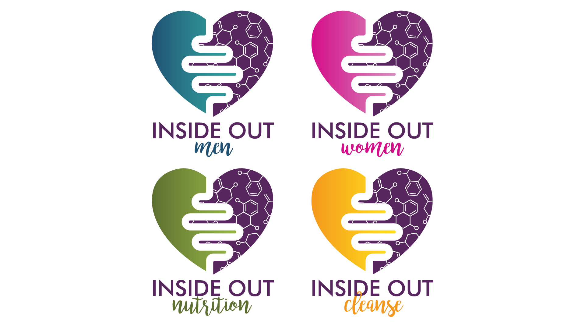 To reflect the company’s blend of science and soul, we emphasized a balance of precise, professional design with organic color palettes and sublogo variations. A suite of sublogos—for Men, Women, Nutrition, and Cleanse—each carries a distinct color scheme while remaining cohesive with the master brand. This flexible system allows Inside Out Health Co to visually represent its individualized, lab-informed yet holistic approach across all areas of service.